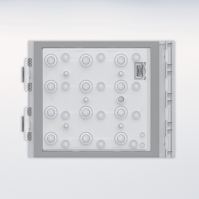 Sfera knappsatsmodul används för att låsa upp dörren eller för digitala samtal till den man vill besöka. Modulen är försedd med relä och kontakter för anslutning till lokal dörrlåsknapp. Enkel programmering med hjälp direkt via knappsatsen eller PC. Försedd med lysdioder för bra synlighet. Anslut modulen till andra porttelfon moduler med lämplig multikabel eller använd som fristående enhet.